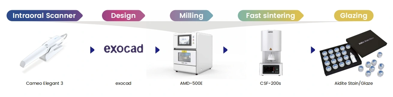 Trên cơ sở thực hiện sản xuất nhanh, Aizir tương thích với nhiều loại vật liệu zirconia Aidite (như SHT-PC, SHTM) để đạt được quá trình tạo ra đồng thời nhiều vật liệu.